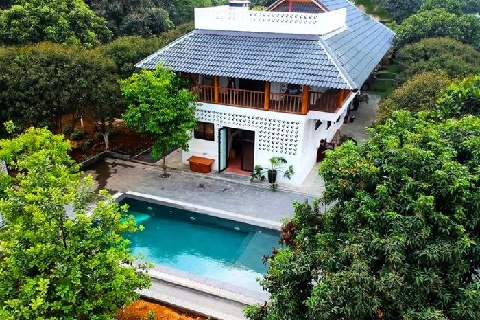 Bao quanh homestay Lương Sơn Hòa Bình giá rẻ là vườn rau, cây ăn quả theo mùa, bể bơi mát lạnh. Ở đây có phòng ngủ 1 giường đôi, 2 giường đôi thiết kế rộng rãi. Ngoài ra, homestay Hòa Bình có bể bơi còn có khu vực phòng bếp tiện nghi, phòng khách, khu vực nướng BBQ hay chòi lá uống nước ngoài trời.