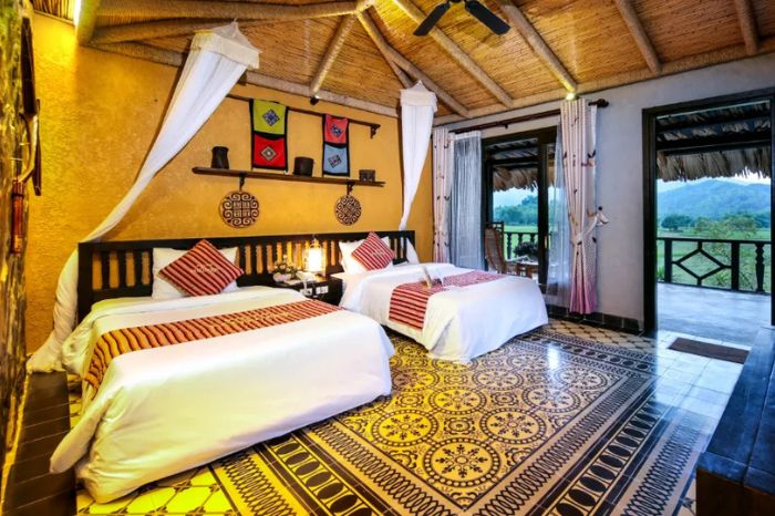 Khách sạn được xây dựng theo phong cách nhà sàn dân tộc Thái, xây dựng từ các vật liệu tự nhiên như mái tranh, nội thất từ tre và gỗ. Mỗi căn phòng đều có ban công riêng rộng rãi, nhìn ra khung cảnh thơ mộng của dãy núi và thung lũng bao la.