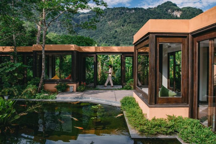Các khách sạn này được thiết kế theo mô hình resort hoặc retreat trải dài trên các sườn đồi hay thung lũng. Vật liệu xây dựng chủ yếu làm từ gỗ, tre, nứa, tầm vông, mái lá tạo cảm giác mộc mạc, gần gũi nhưng không kém phần tinh tế.