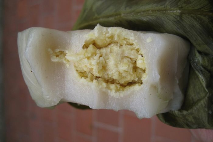 Bánh được làm từ 2 nhân mặn và ngọt: nhân ngọt từ hạt đậu nho nhe hoặc đậu xanh, còn nhân mặn làm từ thịt lợn ướp gia vị. Bánh được gói bằng lá chuối và hấp chín trên chõ. Vị bánh dẻo, quyện cùng phần nhân ngon, đậm đà.