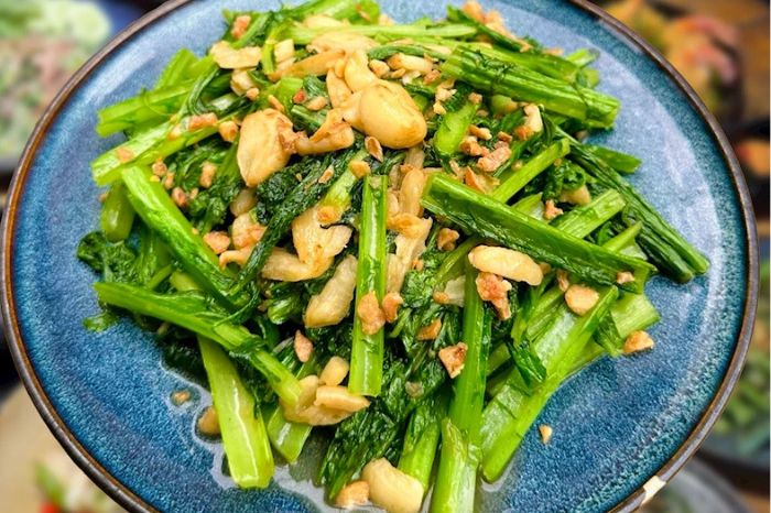 Cải sẽ được cho vào chảo xào cùng tỏi, xì dầu, gia vị và một ít nấm. Món ăn này quyện hòa giữa mùi thơm của tỏi cùng độ giòn, lạ miệng của cải mèo và vị ngọt bùi của nấm, ăn rất cuốn.