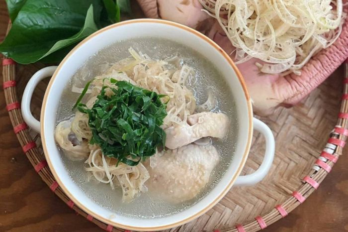 Gà nấu măng chua có màu vàng trăng, vị chua ngọt hài hòa, thịt gà mềm ngọt. Món ăn được dùng để ăn cơm gia đình hoặc đãi khách.