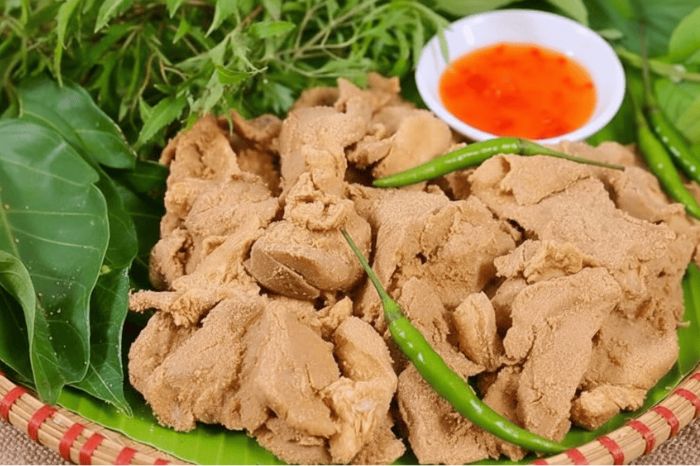 Thịt được ủ chín trong 5 – 7 ngày sẽ có vị chua thanh, béo thơm và hơi cay nồng. Thịt được ăn kèm lá đinh lăng, lá sung và nước mắm tỏi ớt.