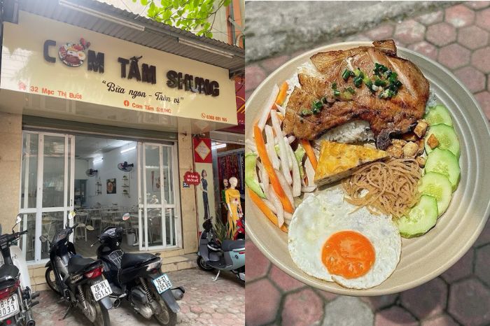 Nếu là người mê cơm tấm dẻo thơm thì bạn có thể ghé tới quán cơm Shung ở Mạc Thị Bưởi. Phần cơm tấm ở đây rất đầy đặn với hạt cơm tơi mềm, thơm dẻo và phần sườn hay gà nướng đậm đà, ướp chuẩn vị.