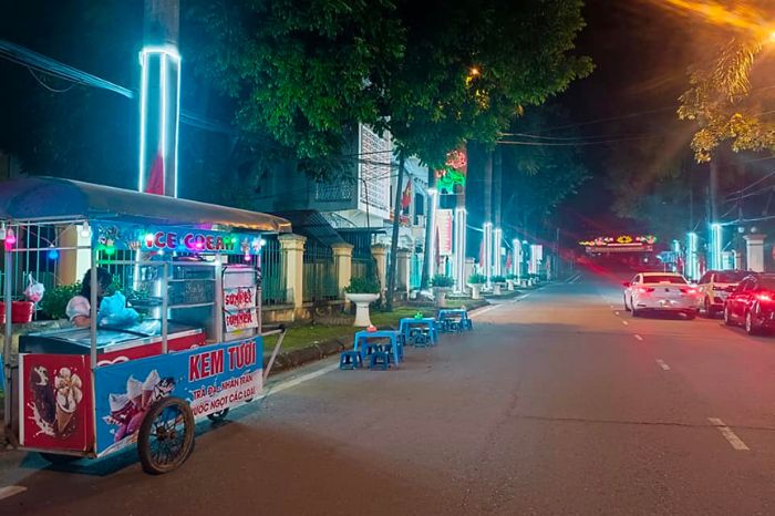 Thêm một quán kem tươi ngon ở Đà Bắc cho bạn thưởng thức. Quán là chiếc xe đẩy nằm ngay vỉa hè bưu điện Đà Bắc. Không gian quán sạch sẽ, mát mẻ.