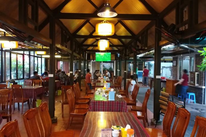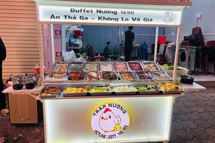 Quán bài trí đơn giản với những bộ bàn ghế gỗ mộc mạc, quầy line buffet phong đủ các món thịt, hải sản, rau, topping ăn kèm. Đến đây, bạn sẽ được thưởng thức bữa tiệc buffet nướng và món lẩu thái cay ngon, đậm đà, uống cùng các loại bia và nước ngọt.